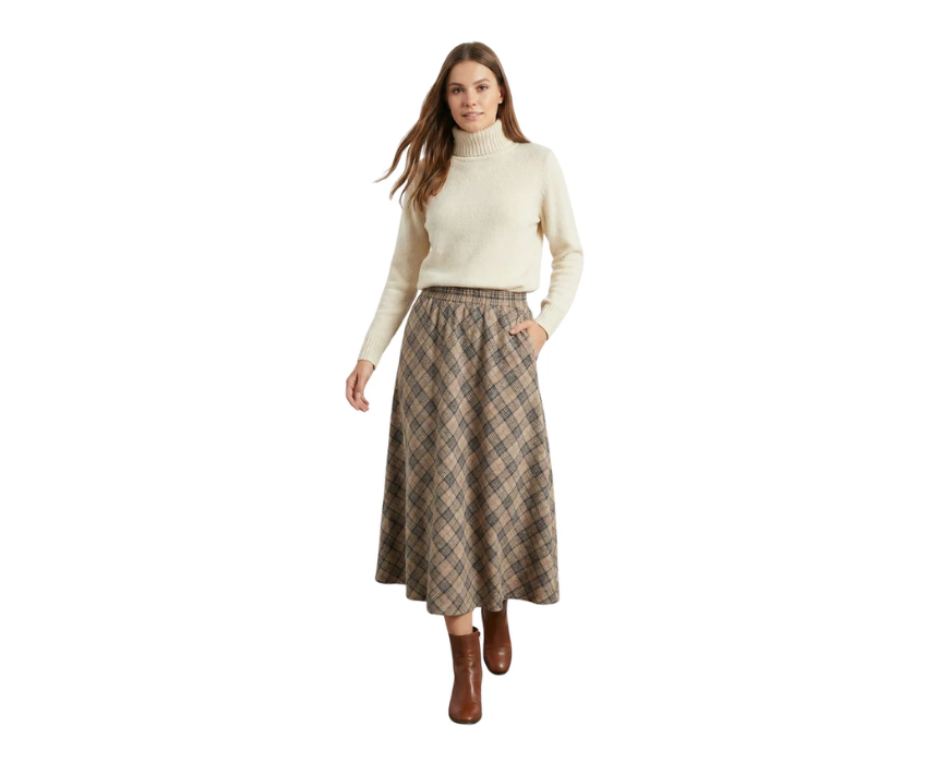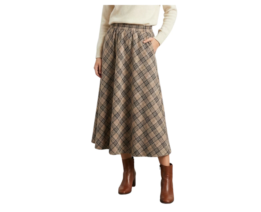 This maxi light brown checked skirt with side pockets features a flowing long length, a classic check pattern, and practical side pockets for everyday comfort. The soft light brown tone makes it easy to style with simple tops, knitwear, or tucked-in blouses for a relaxed yet polished look.