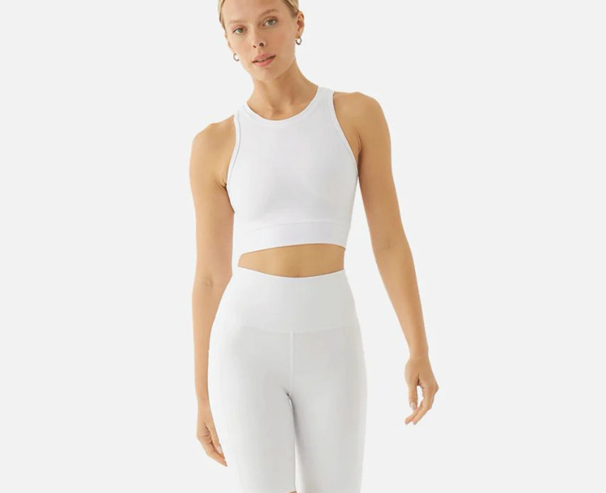 The Medium Support Sports Bra in White for women provides comfortable, breathable support for medium-impact activities such as gym workouts, yoga, or running. Designed with moisture-wicking fabric and a snug fit, it can be paired with leggings or shorts for a complete activewear look.