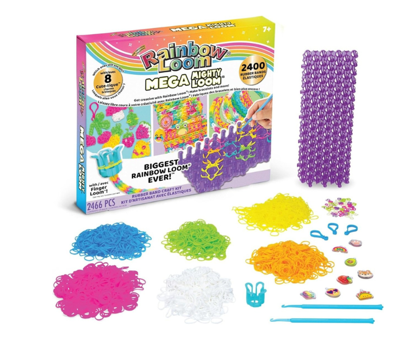 This Mega Mighty Loom craft kit is designed for creating wider and more intricate rubber band designs with taller and closely spaced pins for smoother crafting. It includes 2400 colorful bands, 8 charms, 3 bag clips, 2 hooks, a finger loom, and 50 clips for versatile creations. Ideal for imaginative bracelet making and creative projects for kids and adults.