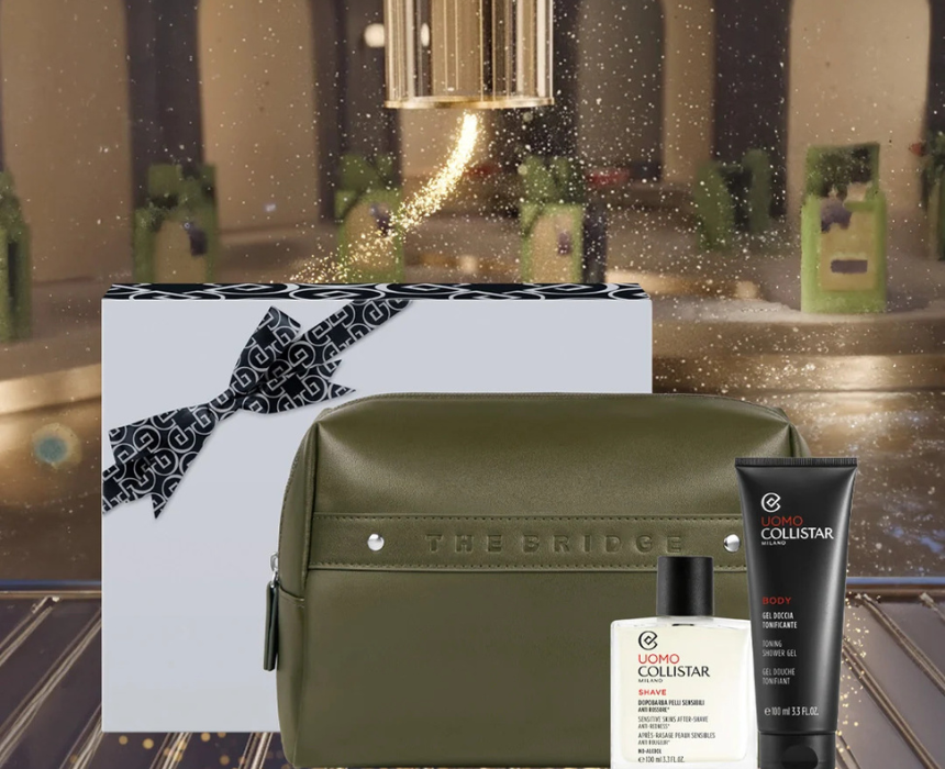 The Collistar Italian Style gift set includes a 100ml Sensitive Skin After-Shave, 100ml Uomo Toning Shower Gel, and an exclusive The Bridge beauty bag. The alcohol-free after-shave soothes and moisturizes sensitive skin while reducing redness, and the shower gel invigorates the body with bergamot water for freshness and vitality. Packaged in a stylish Italian leather bag, this set is perfect for daily grooming or as a luxurious gift.
