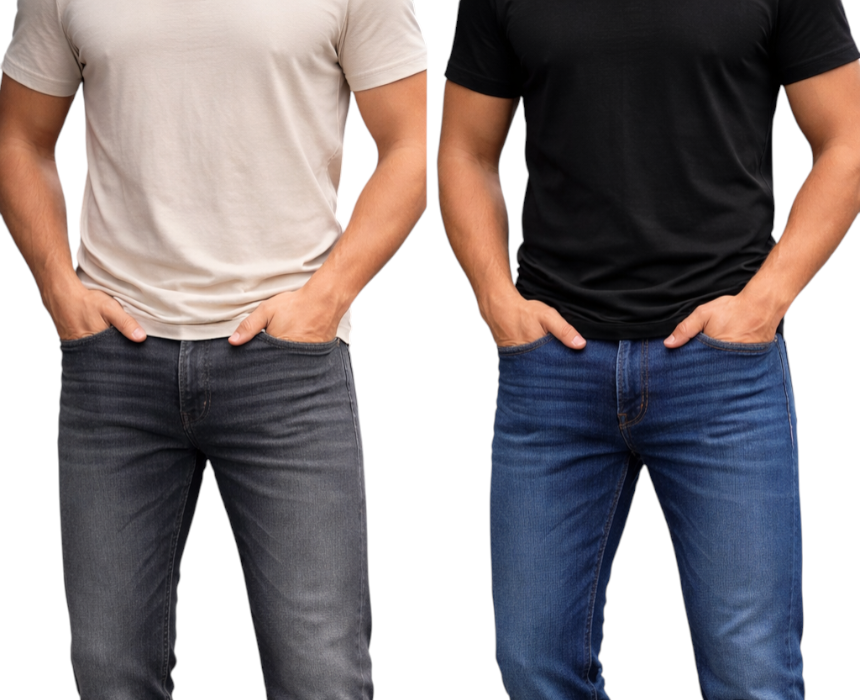 These men’s jeans feature a high-waist straight-cut design made from high-quality denim with Lycra for added comfort. Available in sizes 32, 34, 36, 38, 40, and 42, and also offered in black. Suitable for everyday wear and easy to style with shirts or hoodies.