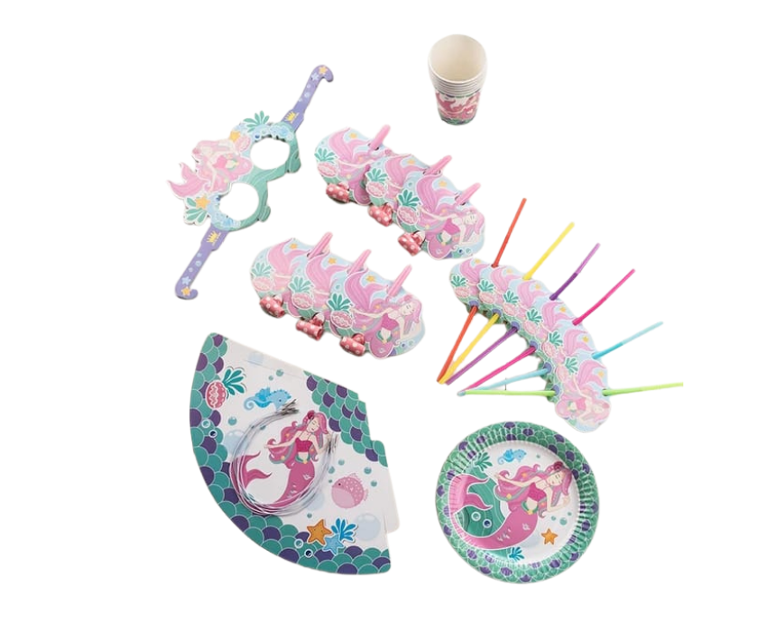 The Mermaid Paper Set includes 6 nine-inch plates, 6 cups, 6 straws, 6 blowers, 6 glasses, and 6 party hats, providing a complete kit for mermaid-themed celebrations. Perfect for birthdays, kids’ parties, or themed events, it makes table setup and party décor simple and coordinated. Its whimsical design adds a fun and festive touch to any gathering.