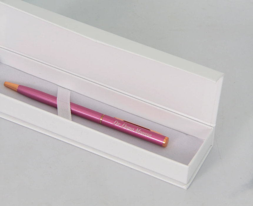 The Metallic Pink Pen is a sophisticated writing instrument designed to elevate your daily note taking with its sleek finish and smooth black ink performance. This elegant pen is available with an optional presentation box for gifting and offers the versatility of interchangeable black or blue ink refills to suit your personal preference. To style this chic accessory, clip it onto the spine of a white leather planner or place it inside a clear acrylic desk organizer to add a luxurious pop of shimmering color to your workspace.