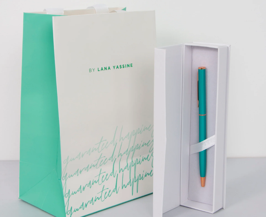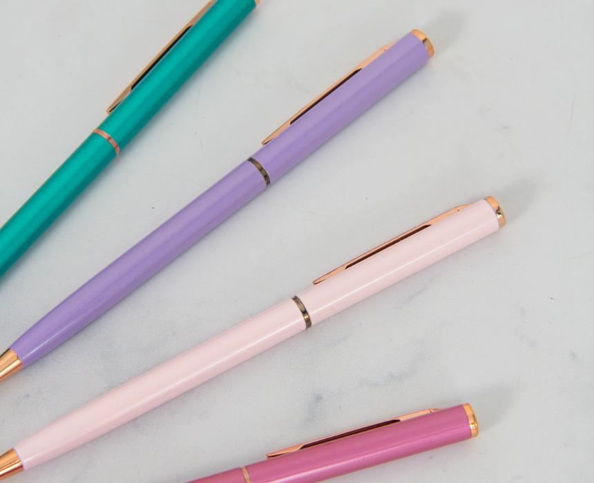 The Metallic Turquoise Pen is a striking writing instrument designed to bring a vibrant pop of color and professional flair to your daily notes. This sleek pen comes standard with smooth black ink and offers the flexibility of an optional gift box, while additional black or blue ink refills can be purchased separately to suit your personal preference. To style this bold accessory, clip it onto a silver spiral planner or keep it in a minimalist white desk organizer to let the radiant metallic finish serve as a sophisticated focal point for your workspace.