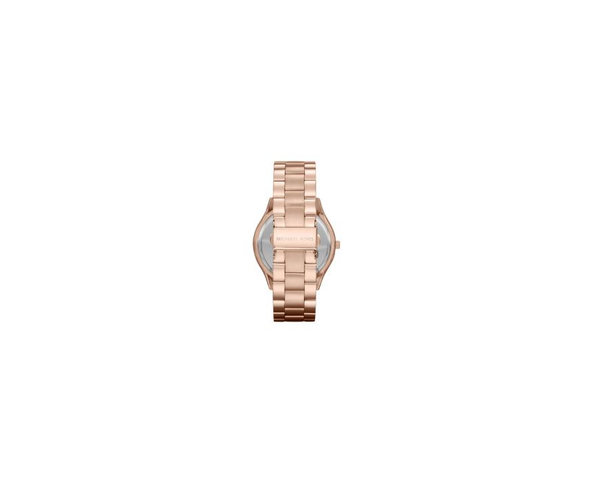 The Michael Kors Vintage Classic Slim Runway ladies watch MK3181 features a rose gold tone stainless steel case and bracelet with a fixed matching bezel and an elegant chocolate dial accented by rose gold tone hands and index hour markers. Designed with precise quartz movement and water resistance up to 50 meters, this slim dress watch offers timeless style and reliable everyday wear.