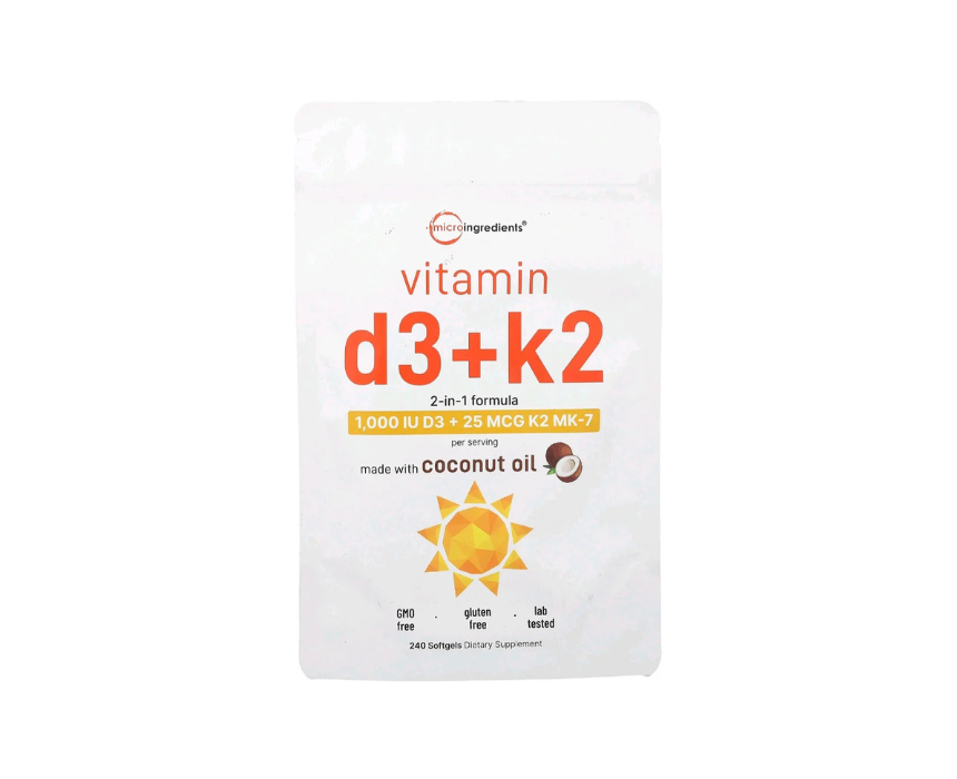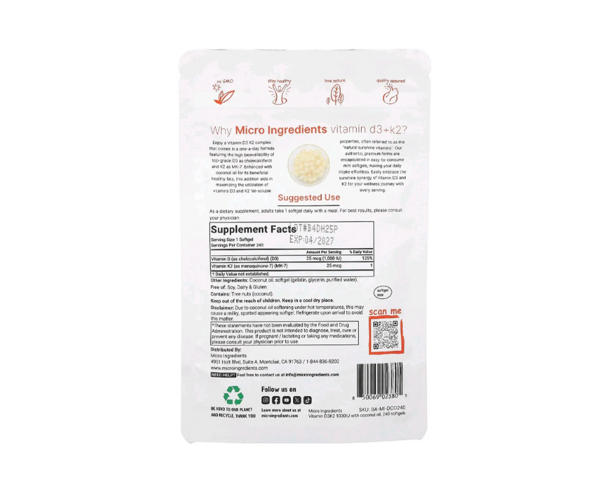 Micro Ingredients Vitamin D3 plus K2 provides 240 servings of a one a day formula delivering 1000 IU D3 and 25 mcg K2 MK7 in mini softgels enhanced with coconut oil for optimal absorption. This GMO free, gluten free, lab tested supplement supports daily wellness with highly bioavailable forms of the sunshine vitamins. Take one softgel with a meal to easily fit it into any routine.
