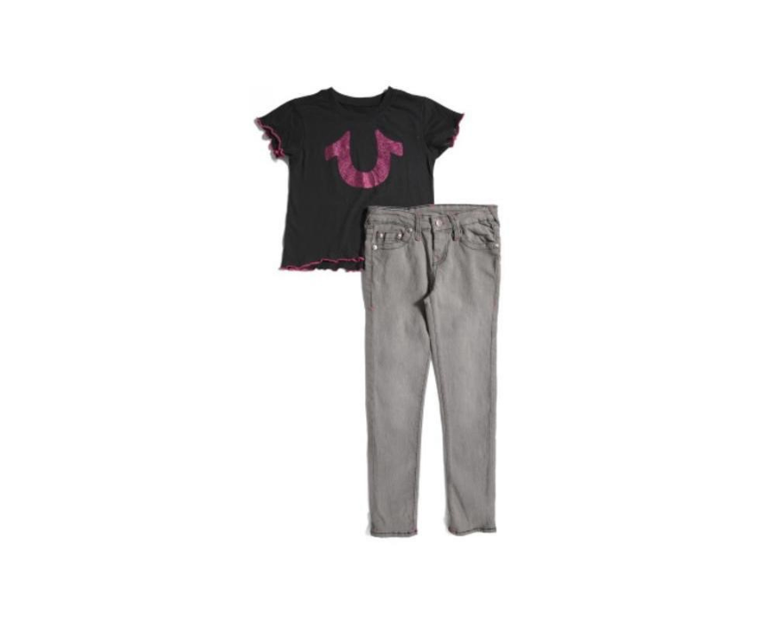 <p>This stylish girls outfit includes a black short sleeve True Religion t shirt with a pink glitter horseshoe logo and ruffle trim, paired with sleek gray skinny jeans. Designed for girls ages 8 to 10, it offers a comfy, trendy look perfect for school, weekend outings, or casual events with a fun mix of sparkle and modern street style.</p>