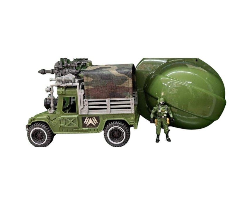 The Military Toy Set is ready for a high-stakes patrol! This comprehensive set features an Army Military Jeep with a soldier action figure and a camouflage-covered truck. It even includes a helmet for the child to wear, immersing them fully in their imaginative defense missions. Designed for active play, it encourages storytelling, social interaction, and hero-themed adventures. Dimensions: 56×25 cm. A great gift for kids who love action figures and vehicles. Sturdy and safe. Ages 3+.