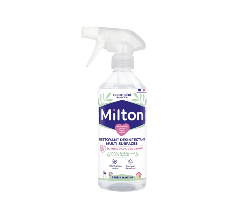 Milton Disinfectant Spray 500 ml is a fast-acting, bleach-free surface spray that cleans and disinfects, killing 99.9% of germs including bacteria, yeasts, and viruses. Its plant-based, alcohol-free formula is safe for use on baby items, kitchen surfaces, and everyday household areas, leaving a fresh mint scent. Simply spray onto surfaces, leave for 5 minutes, and wipe clean for hygienic, germ-free results.