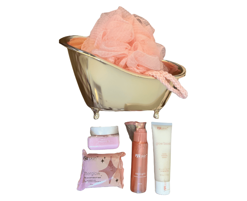 Mini Bath Set is a curated self-care collection designed to pamper your skin and senses. Perfect for all skin types, this luxurious set gently cleanses, exfoliates, and nourishes, leaving skin refreshed and radiant. Includes After Glow Soap, Mini Vagicare Feminine Wash, Mini Glow Boost Milky Wash, Mini Derm Exfoliator, a pink loofah, pink mesh bag, and a mini rose gold bath tub—ideal for travel or gifting.