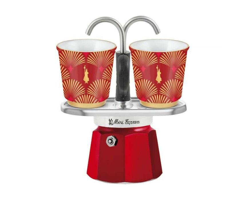 The Bialetti Mini Express Deco Glamour offers a stylish twist on the classic Moka Express, featuring a unique Art Deco-inspired design from the 1920s. The set includes two ceramic cups, a patinated aluminum body with stainless steel tubes, and a heat-resistant polyamide handle for safe brewing. With elegant gold motifs on a red background, this limited edition collector’s piece delivers authentic Italian espresso in extraordinary style.