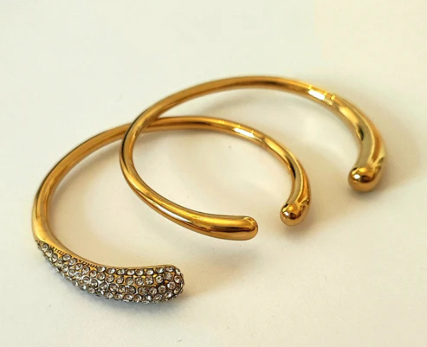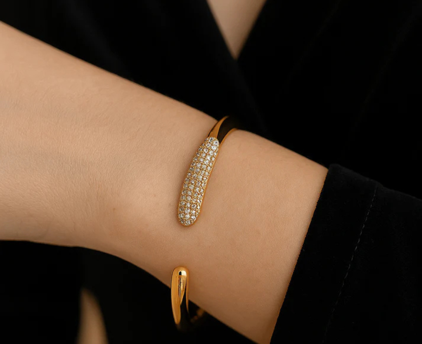 This minimalist adjustable bangle is crafted from durable stainless steel with an elegant 18K gold plated finish and a subtle zircon accent, offering water resistant shine and everyday durability. Designed for a comfortable adjustable fit, it blends clean lines with refined sparkle, making it ideal for daily wear or special occasions. Style it solo for a sleek look or stack it with other bangles for effortless modern layering.