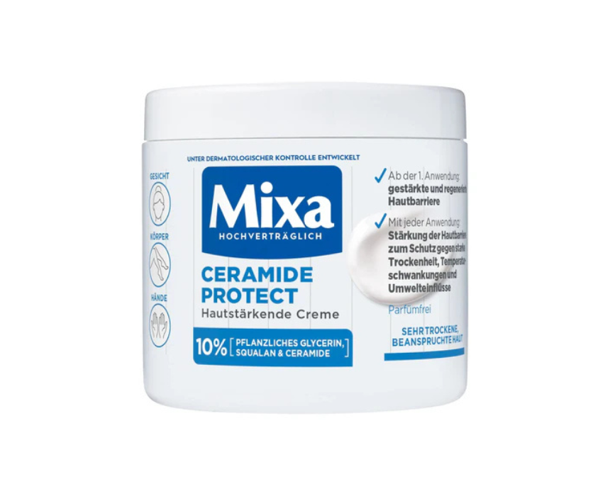 Mixa Ceramide Protect Strengthening Cream 400 ml is a fast absorbing non greasy cream for very dry and stressed skin suitable for babies children and adults. Enriched with 10 percent plant based glycerin squalane and ceramides it provides up to 48 hours of moisture while strengthening the skin barrier on the face body and hands from the first use. Apply after cleansing and massage gently until absorbed leaving skin soft smooth and protected before dressing.
