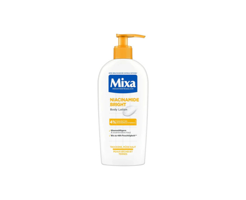 Mixa Niacinamide Bright Body Lotion in 250ml nourishes dry and tired skin with 4% shea butter, niacinamide, and vitamin C, providing up to 48 hours of moisture. Its fast absorbing, non greasy formula leaves skin smooth, radiant, and healthy looking. Apply daily after cleansing, massaging gently until fully absorbed for revitalized and comfortable skin, suitable for all skin types including sensitive skin.