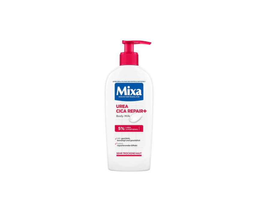 Mixa Urea Cica Repair+ Body Milk nourishes and repairs very dry, flaky skin with 5% urea and panthenol, providing 48 hour protection and soothing relief. This fast absorbing body lotion strengthens, hydrates, and smooths skin without leaving a greasy residue, leaving it soft and comfortable. Apply after cleansing to dry skin and massage in gently for instant repair and long lasting care.