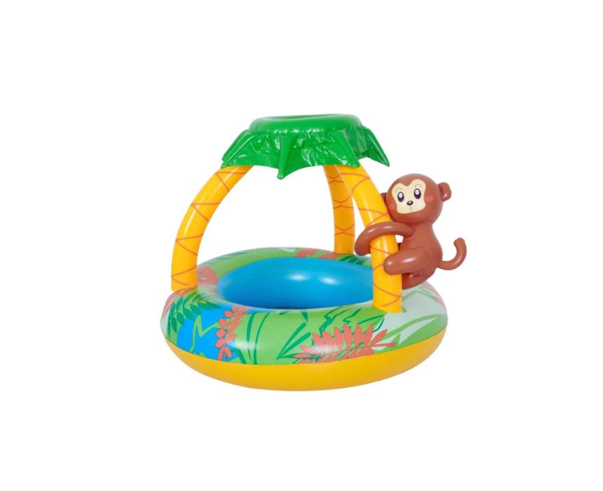 The SunClub monkey baby pool with canopy is ideal for toddlers aged 1 to 3, offering a shaded and safe spot to cool down during hot summer days. With a water capacity of 40 liters and recommended for children weighing 11 to 18 kg, its compact 102x102x80 cm size fits perfectly on beaches, balconies, gardens, or by the pool. The built-in canopy provides sun protection, making it easy for parents to keep little ones comfortable and stylish while enjoying water play Designed for kids aged 1+.