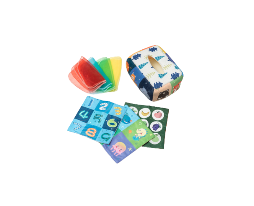 The Baby Tissue Box Toy is perfect for endless fun! With 3 double-sided rattles and 8 colorful gauze tissues, it keeps babies engaged for hours. Made from safe, soft, and durable fabric, it’s built to last and gentle on little hands. This sensory toy helps develop vision, hearing, attention, and color awareness, an ideal choice for early brain development! Designed for kids aged 1+