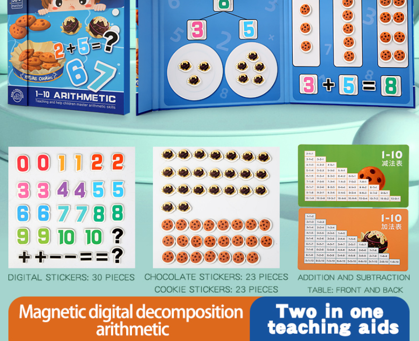 The Montessori Magnetic Sticker Arithmetic Book makes learning addition and subtraction fun and interactive. Measuring 22cm x 21cm x 1.5cm, this educational tool helps children practice basic math concepts through engaging magnetic stickers, supporting logical thinking, problem-solving, and early cognitive development. Perfect for preschoolers at home or in the classroom. Designed for kids aged 3+