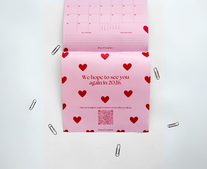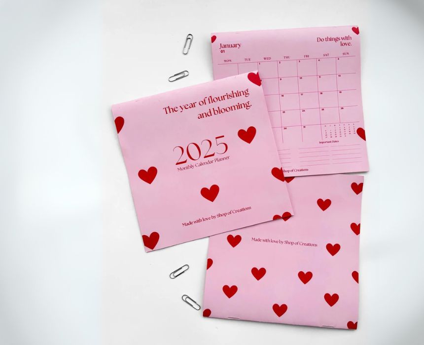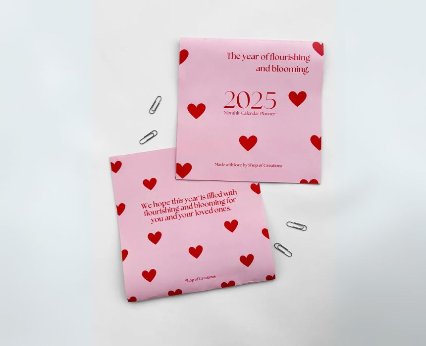 Stay organized and inspired with this 2025 pink heart-pattern monthly calendar, designed to hang easily on any wall. Measuring around 20×20 cm with portrait short edge binding and a punched hole, it offers a clear two-month view, unique quotes each month, and fillable sections for your top five priorities and important dates. Its charming design adds a touch of warmth, making it both a practical and stylish addition to your space.