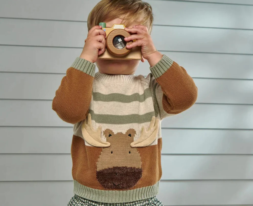 This brown moose character knit jumper is an adorable addition to little ones’ wardrobes, perfect for casual outings and playtime. Featuring a playful moose design with 3D antlers, stripe detailing, long sleeves, back button opening, and ribbed hem and cuffs, it combines comfort with fun, tactile details. Ideal for layering over tops or wearing on its own, this jumper keeps babies cosy and stylish.