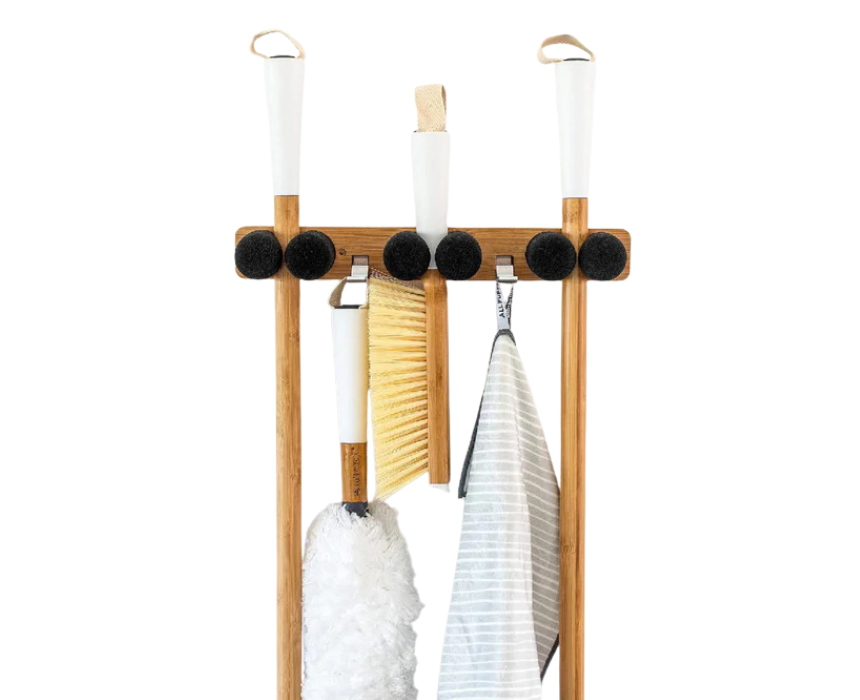 The Full Circle Get A Grip Mop and Broom Organizer keeps your long-handled cleaning and garden tools neatly stored off the floor, perfect for closets, laundry rooms, garages, or entryways. Featuring wall-mounted foam gripper pegs, retractable hooks, a bamboo baseplate, and durable aluminum hooks, it combines style with functionality. Easy to install with included hardware, it maximizes space while using eco-friendly materials for sustainable home organization.