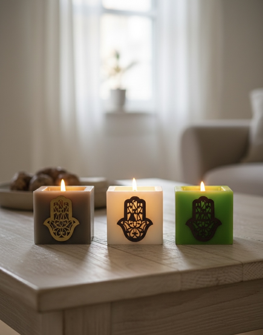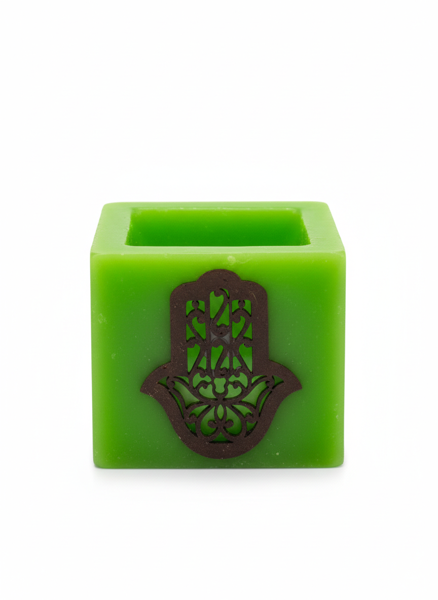 Bring the vibrant soul of Marrakech into your home with these handcrafted Moroccan wax lanterns. Featuring the Hand of Fatima – or the Hamsa symbol, these holders are designed to glow from within, casting a warm light through their wax walls. Each is a perfect cube measuring around 3x3x3 inches, making them a perfect addition to your home decor. Available in cream, grey, and green.