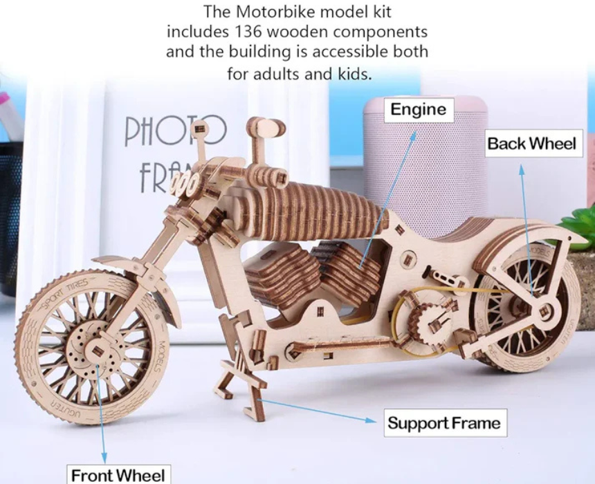 The Motorcycle 3D Mechanical Wooden Puzzle is a detailed precision cut wooden model that assembles into a realistic motorcycle with moving mechanical parts. Designed for an immersive hands on building experience it showcases exposed gears and smooth motion once completed. Perfect for styling on a desk shelf or display case it adds a bold handcrafted accent and makes a great gift for motorcycle and puzzle fans.