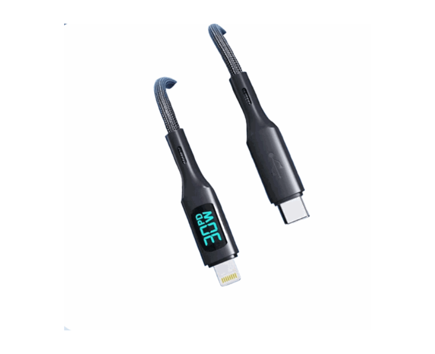 A fast charging cable designed with USB C to Lightning connectivity for efficient power delivery and data transfer. It features a built in display for monitoring charging performance, making it ideal for everyday use with compatible devices.