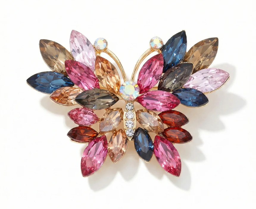 This multi color crystal butterfly brooch features a radiant gold tone finish, adorned with sparkling crystals that catch the light beautifully for an elegant, eye catching look. Designed for versatile styling, it can be pinned to blazers, dresses, scarves, or handbags to instantly elevate any outfit. A timeless accessory that adds charm and sophistication to both casual and formal wear.