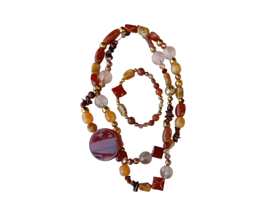 This long handmade necklace and bracelet set features a warm combination of brick, orange, yellow, brown, and beige tones. Crafted with various colored beads, crystals, wooden beads, and natural stones, it reflects the colors of the earth and sunset. This coordinated set is perfect for those who love a bohemian or rustic aesthetic. The variety of materials ensures a textured, interesting look that pairs beautifully with neutral-colored clothing.