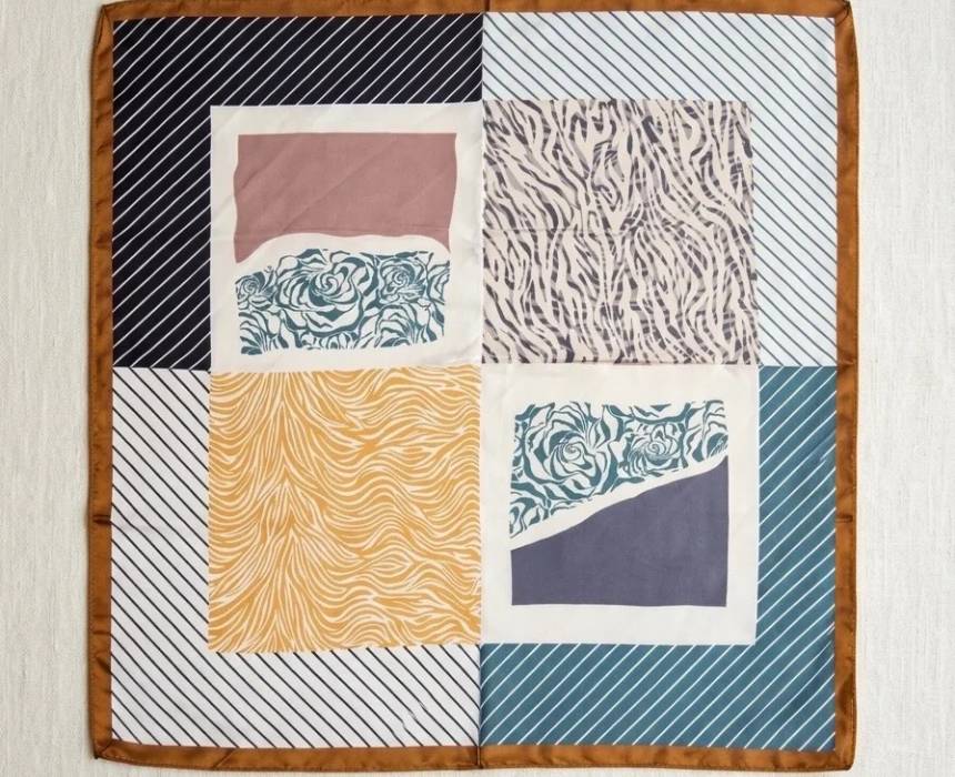 This square scarf features a modern patchwork inspired design with floral, striped, and abstract patterns in a rich multicolor palette. Its balanced tones of rust, mustard, teal, navy, and cream make it easy to style with both casual and polished outfits. Wear it around the neck, in the hair, or on a bag for an instant elegant upgrade.