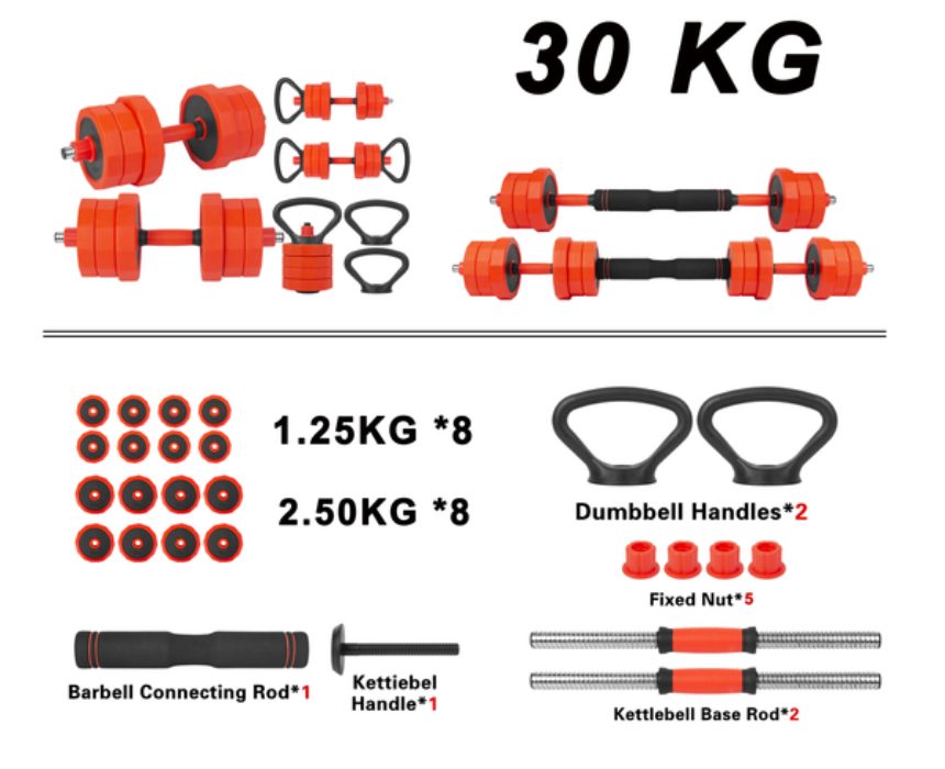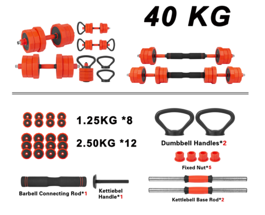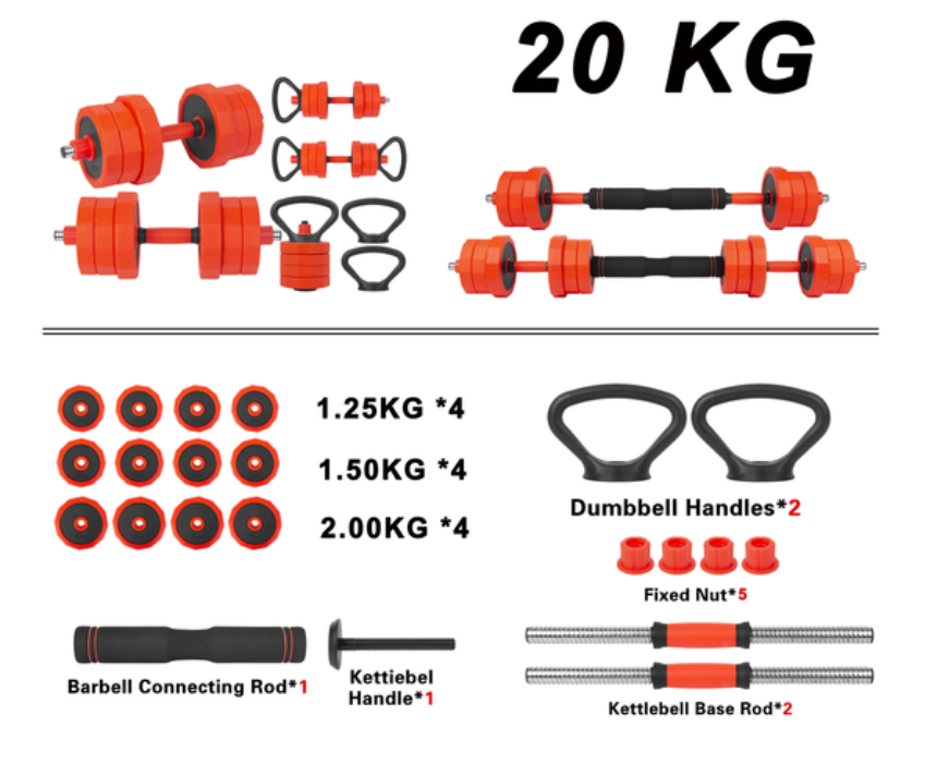 The Blaze Multifunction Dumbbell Set is a 4-in-1 strength system that converts into dumbbells, a barbell, a kettlebell, or a push-up stand, available in 20kg, 30kg, and 40kg sets for full-body workouts at home or in the gym. Each set includes weight plates, ergonomic rods, a connecting bar, and secure spin-lock nuts, offering adjustable resistance and safe, comfortable training. For best use, assemble the desired configuration, ensure all locks are secure, and maintain proper form during each exercise.