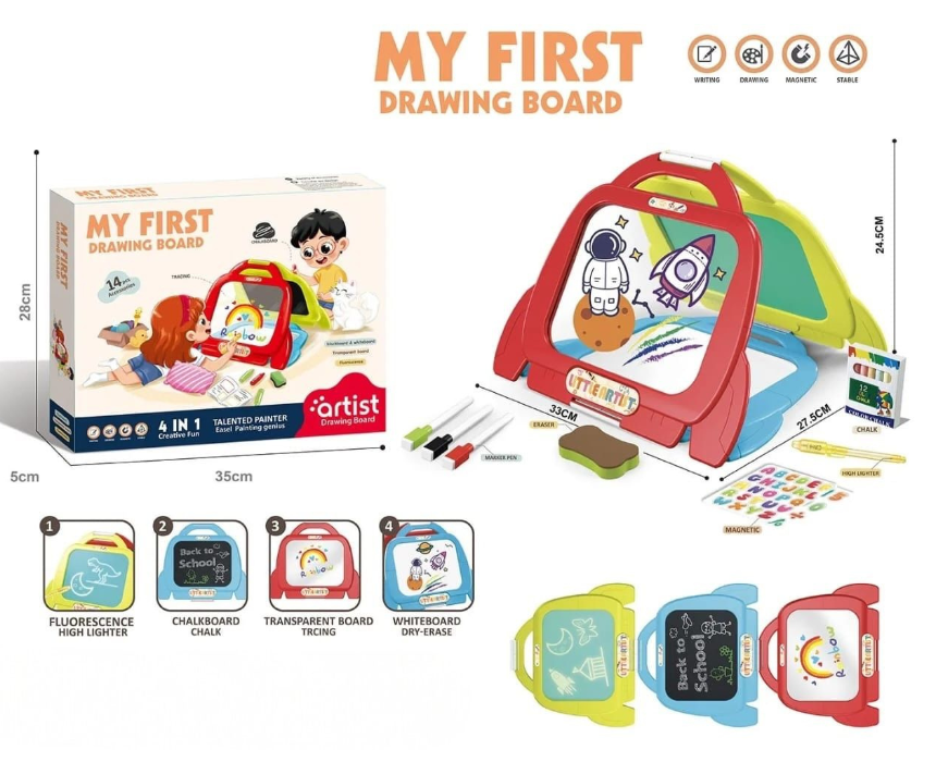<p>This creative drawing board set includes 14 accessories and features four panels to draw and write on, including a fluorescence highlighter board, chalkboard, transparent board, and whiteboard. Designed to inspire imagination and self expression, it helps children develop creativity and early learning skills, making it suitable for ages 3 and above.</p>