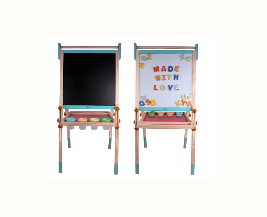 Designed for children aged 3 and up, this Classic World foldable easel features a chalkboard and a magnetic whiteboard for drawing and learning. The easel includes plastic paint cups and magnetic English alphabets, with adjustable height for growing children. It encourages creativity, early literacy, and imaginative play.