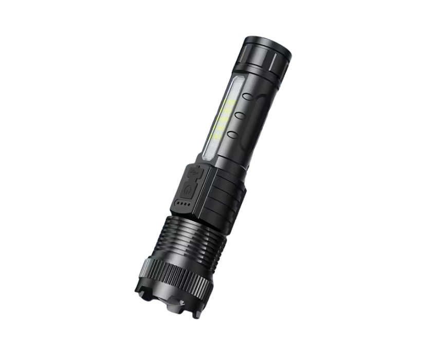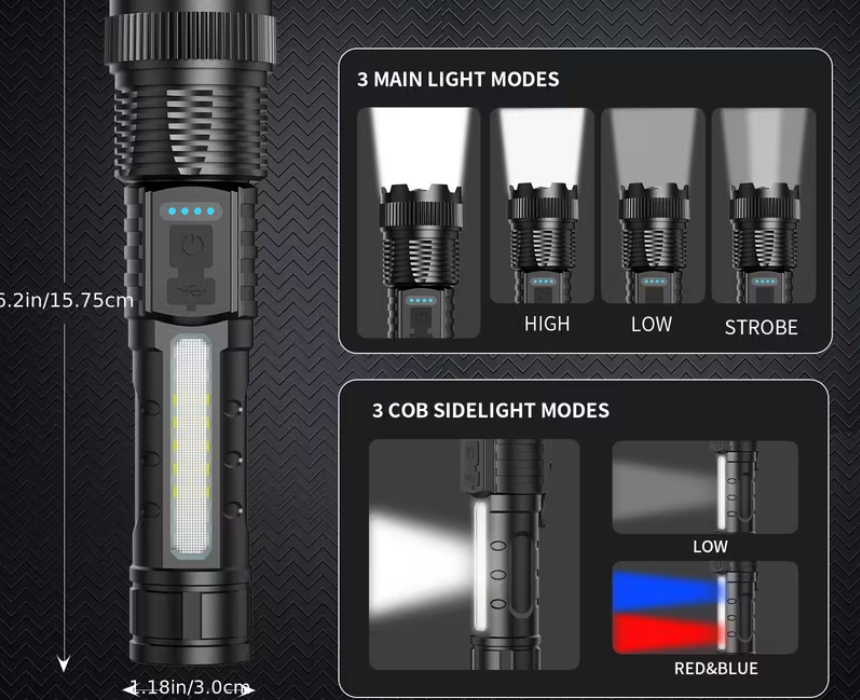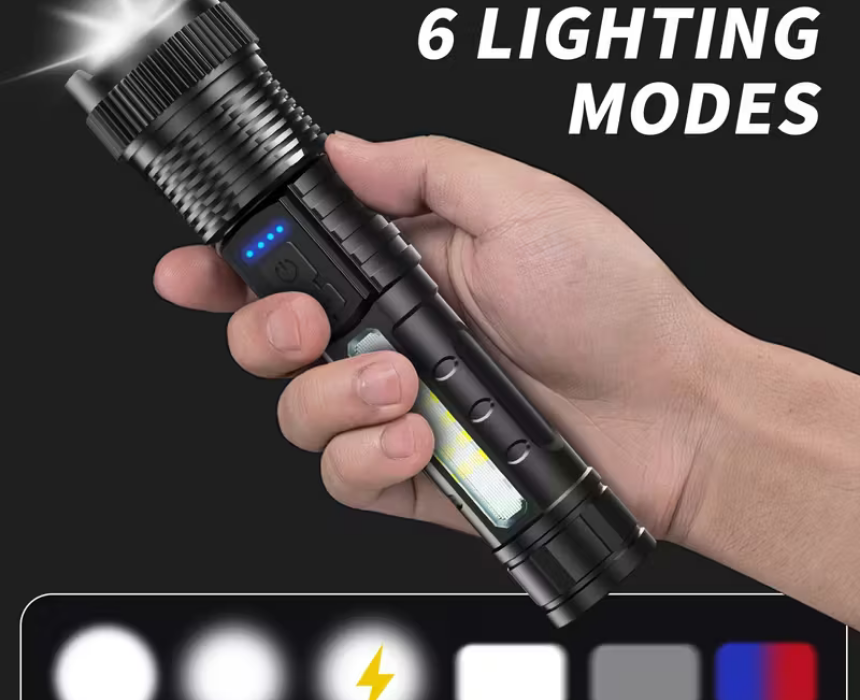 The Multifunctional High-Lumens Rechargeable LED Flashlight delivers powerful, clear illumination with six lighting modes and a COB side light for close-up tasks. Zoomable between spotlight and floodlight, it features USB-C rechargeable battery, IP44 water and dust resistance, and a durable handheld design. Ideal for emergencies, camping, hiking, work, or everyday use, it provides reliable, versatile lighting whenever you need it.
