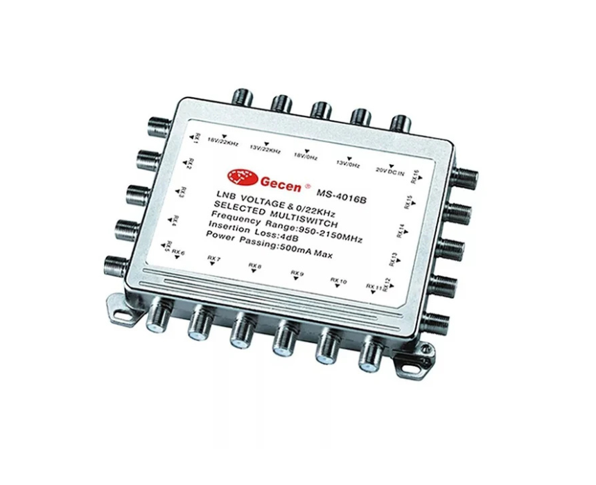 The Gecen 4×16 MS-4016 Satellite LNB V/H multi-switch allows simultaneous distribution of four SATV signals to up to sixteen outputs without interference. It features a zinc die-cast nickel-plated housing, professional low-loss circuitry, frequency range of 950-2150 MHz, output level of 95 dBuV, and is powered via 13/18V and 0/22KHz signals from satellite receivers. Compact and reliable, it is ideal for multi-user satellite TV installations at home or small buildings.