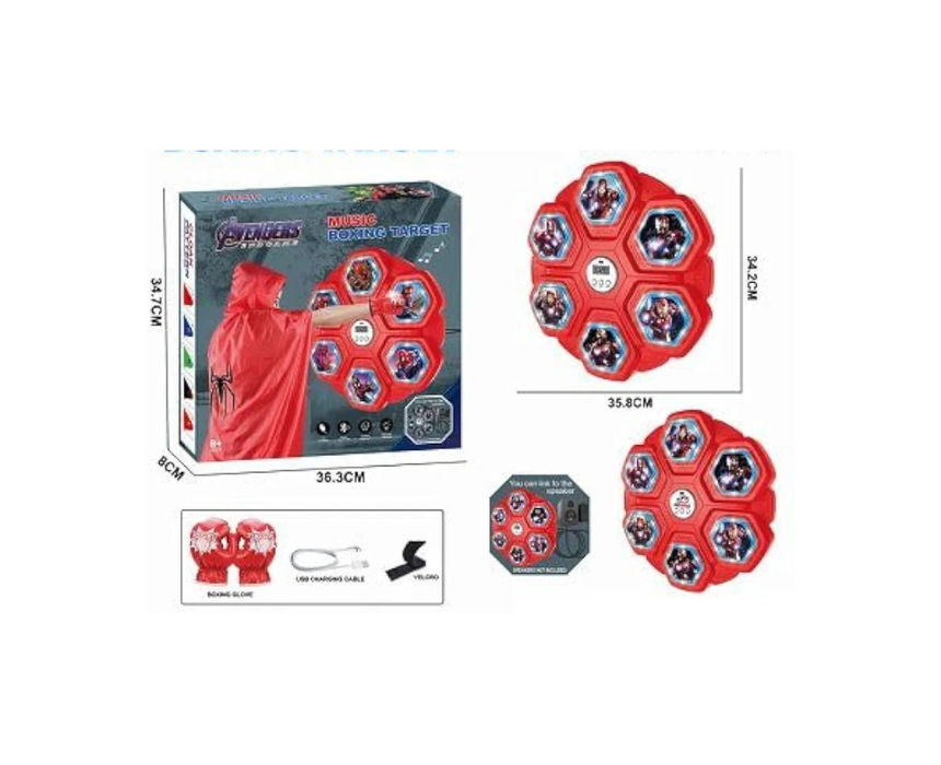 Train like a hero with the Avengers Music Boxing Target. This interactive punching pad lights up and plays music while kids hit Avengers themed targets. With Bluetooth music playback, a digital score display, boxing gloves, USB charger, and cloak included, it makes exercise fun while developing agility, focus, and energy. Suitable for kids aged 8 and up.