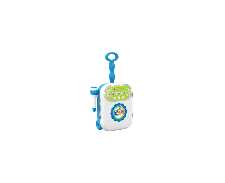 The “My Music World” musical luggage set is a portable karaoke toy for children ages 3 and up, featuring wheels for easy carrying and an included microphone. It offers built-in songs, sound effects, colorful lighting, and USB or 3.5mm audio connectivity to play music from phones or tablets. Kids can roll the luggage along and sing along for fun, interactive musical play at home or on the go.