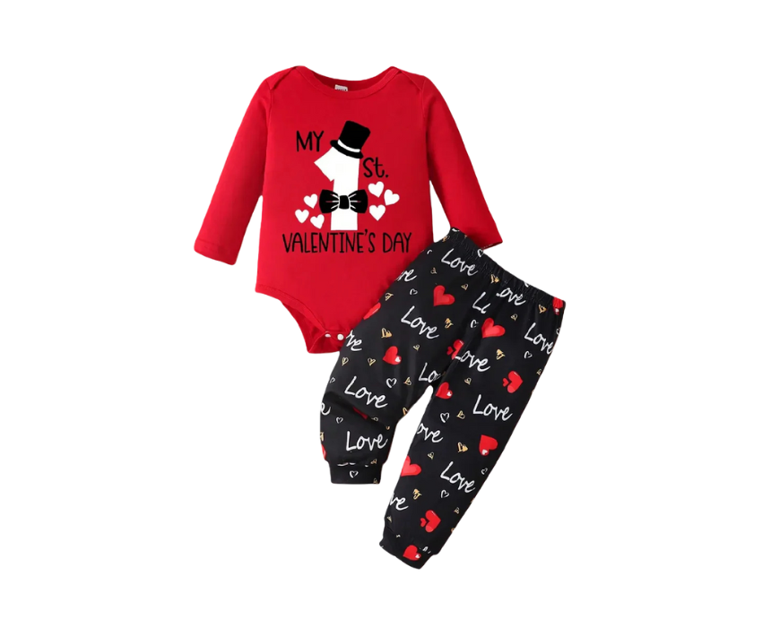 The My 1st Valentine’s Day 1–3 Months Outfit is a cute and cozy 2-piece set, featuring a red long-sleeve bodysuit and matching heart-print pants. Made from soft, comfortable fabric, it is perfect for photos, gifts, and celebrating baby’s first Valentine’s Day. Ideal for layering with socks or soft shoes, it creates a charming and festive look for little ones.