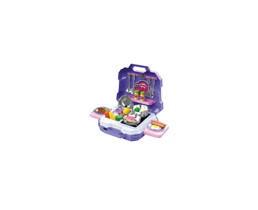 The My Little Pony Kitchen Set Toy brings imaginative cooking adventures to life with a portable, attachable case designed for easy storage and travel. Complete with assorted kitchen accessories and pretend food items, it helps nurture creativity, imagination, and motor skills through hands-on role play. Children can arrange the pieces neatly and pretend to wear a chef hat to create their own magical kitchen experience.