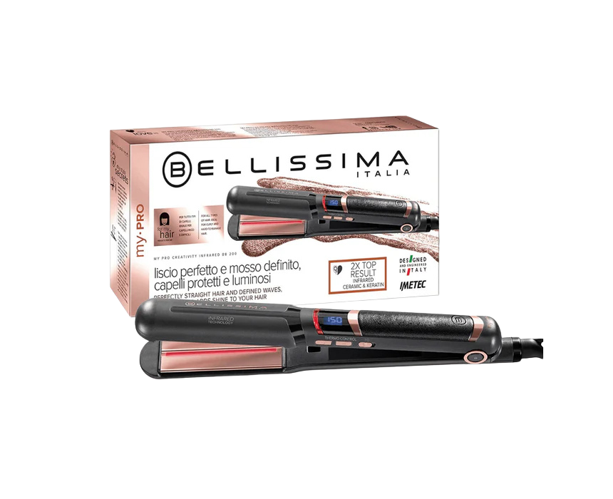 This professional hair straightener features infrared technology to protect hair while enhancing shine. Its ceramic and keratin-coated plates provide silky, elastic, and vibrant hair, while the 4-panel system delivers perfectly straightened styles or defined curls. Oscillating plates adapt to each strand for smooth results from root to tip, and the second set of plates locks in the style for a flawless finish, with a panel size of 30 x 90 mm.