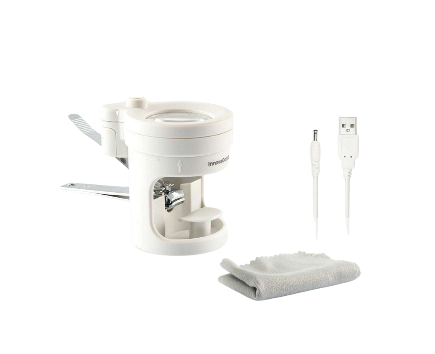 The InnovaGoods Nail Clippers with LED Light, Magnifying Glass, and File Clail make nail care easier and more precise, featuring 4 LED lights, an x8 magnifying glass, and a metal nail file. Ergonomic and multifunctional, they are ideal for older people and children, with a non-slip base and removable magnifier for versatile use. Use them with batteries or USB for a clear, professional finish every time.