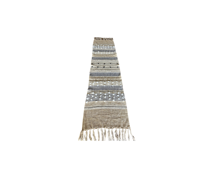 The Natural Earth Tone Artisan Table Runner enhances any dining space with its handwoven jute and cotton blend, featuring soft beiges, charcoal greys, and ivory pom-pom accents for a relaxed yet refined look, complete with fringed edges and raised textures, perfect for casual meals or styled tablescapes, measuring 45x180cm to suit most tables.