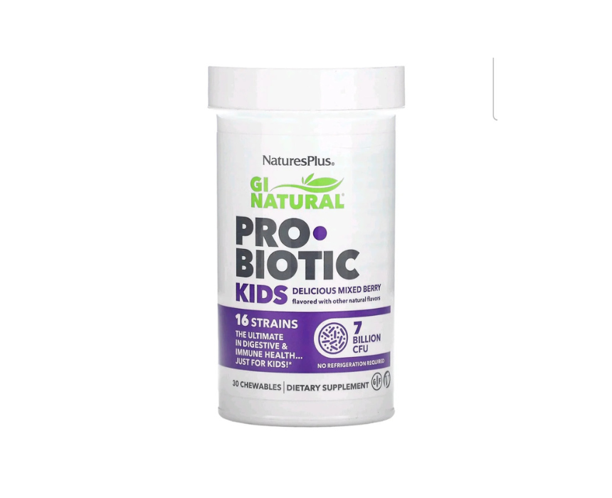 NaturesPlus GI Natural Probiotic Kids provides 7 billion CFU from 16 clinically backed strains in a tasty mixed berry chewable designed to support children’s digestive, immune, respiratory and skin health. This sugar free, gluten free, vegan and non GMO formula requires no refrigeration and is crafted in a fully accredited GMP facility. Kids can simply chew one daily as part of their wellness routine. It contains 30 Chewables