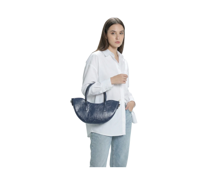 This navy half moon shaped bag features a sleek curved silhouette with a sturdy handle strap for comfortable carrying. Designed to hold daily essentials, it offers a refined yet modern look suitable for everyday use. It styles easily with casual outfits, workwear, or neutral tones for a clean, polished appearance.