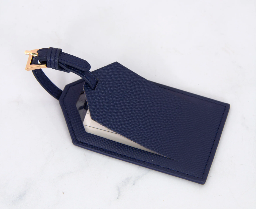 This navy vegan leather luggage tag is a sophisticated travel essential designed to keep your belongings identifiable and secure. Crafted from durable high quality materials, the deep blue finish adds a professional and timeless touch to any travel ensemble. To style this tag, simply fasten it to the top handle of a navy or tan suitcase for a classic nautical look, or attach it to your favorite weekend duffel bag to make it stand out at the airport.
