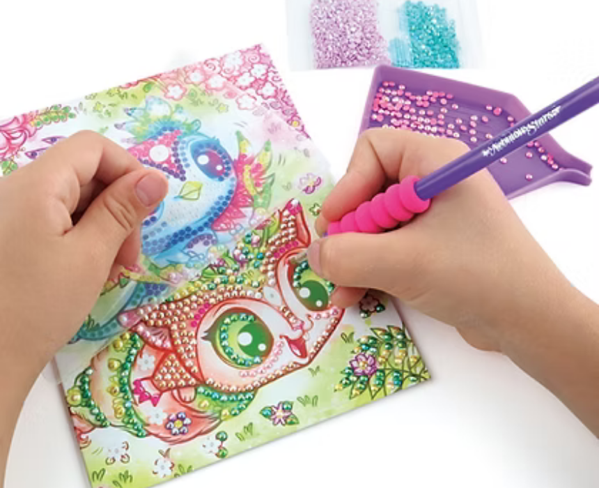 The Nebulous Stars Dazzle by Number Rainbow kit lets kids create three sparkling artworks by placing over 4500 micro gems onto pre printed adhesive boards. With a rhinestone pen applicator, tray, wax square, and color coded instructions included, children can easily follow the numbers for dazzling results while improving focus and fine motor skills through creative play.