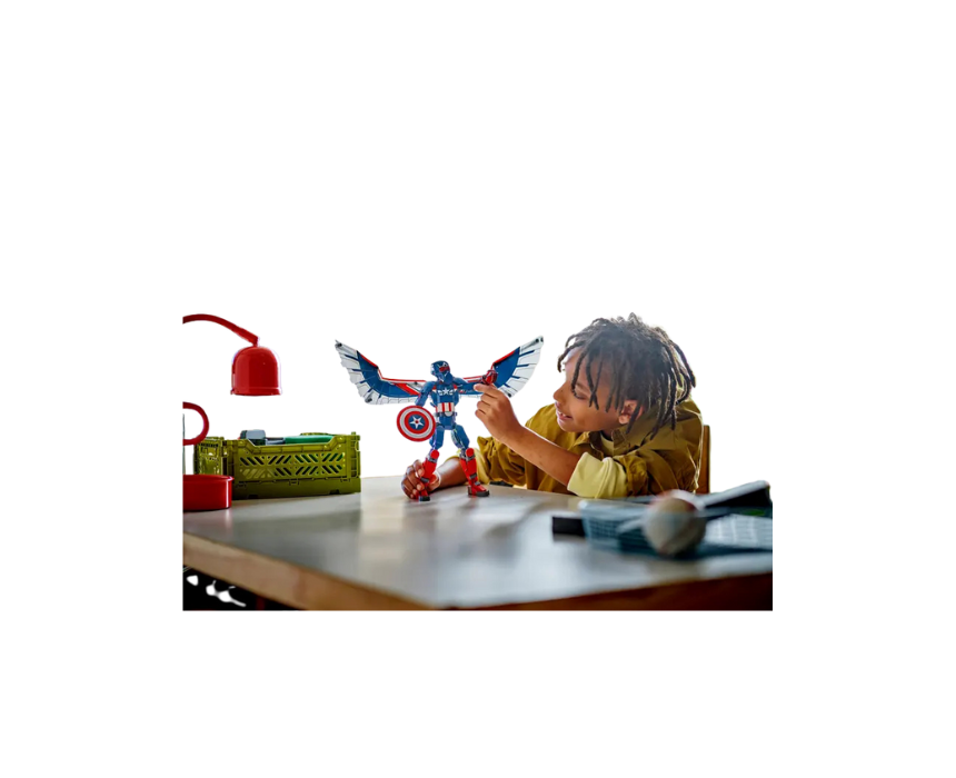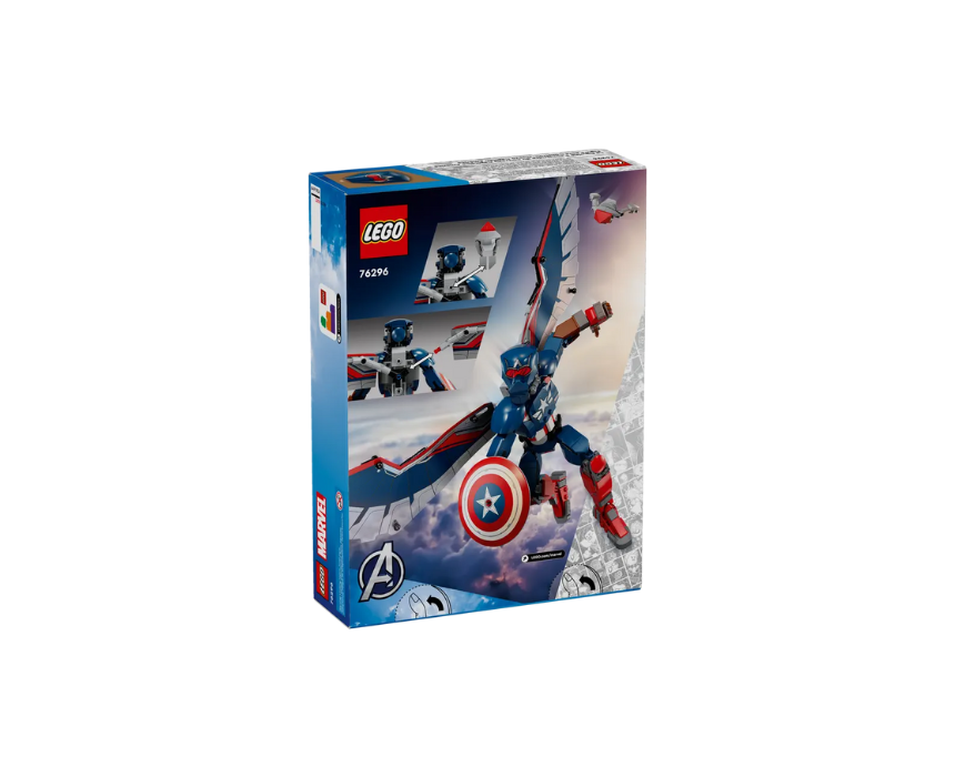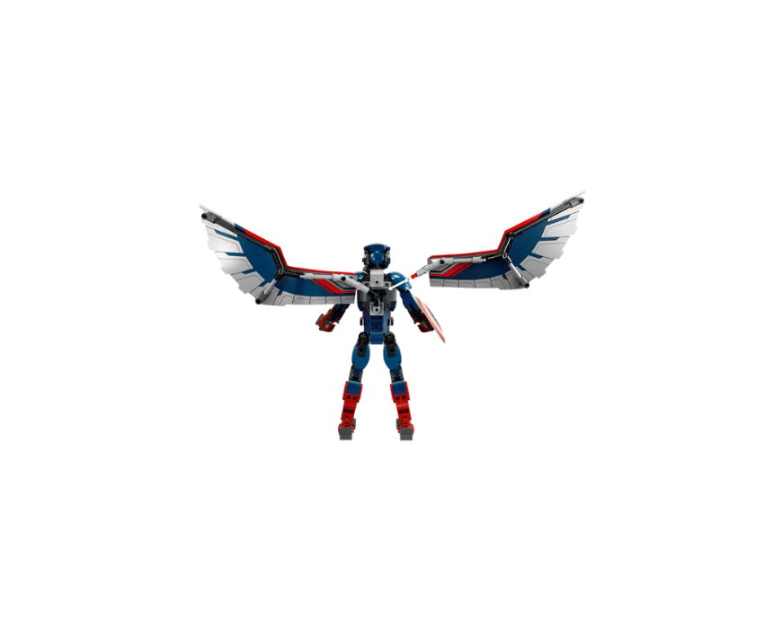 LEGO Marvel New Captain America Construction Figure (76296) is a 359-piece, fully jointed Super Hero toy for kids aged 8+, featuring the Falcon as Captain America with large bendable foil wings, an iconic shield and a detachable Redwing drone. Standing over 11 inches tall with movable joints for dynamic poses, it is ideal for action-packed play or stylish display on a shelf or desk with wings attached or removed for ground missions.