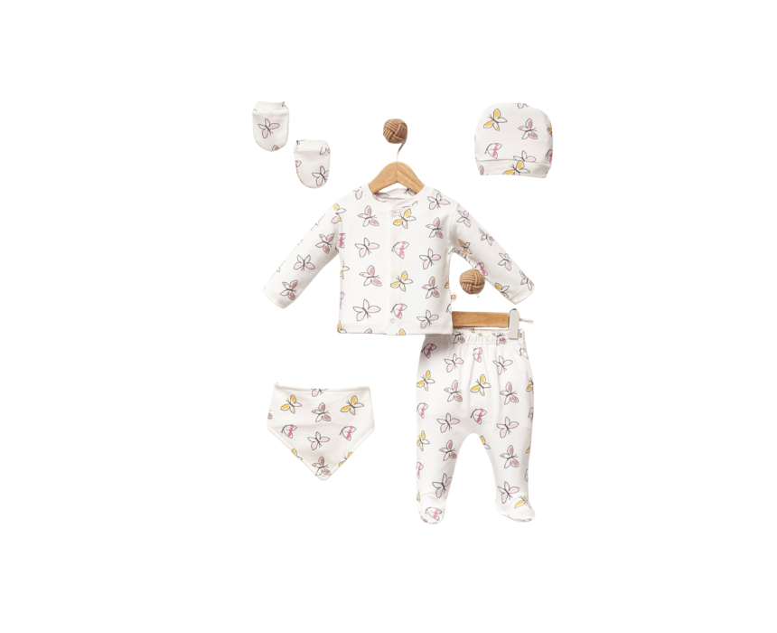 The Newborn Butterfly 5-Piece Set brings softness, comfort, and charm to your baby’s first months. Designed for ages 0–3 months, this white set features gentle butterfly-themed details that add a touch of elegance while keeping your baby cozy. Made from soft, breathable fabrics suitable for delicate newborn skin, it includes all the essentials parents need for everyday dressing. Perfect for gifting or preparing your hospital bag.