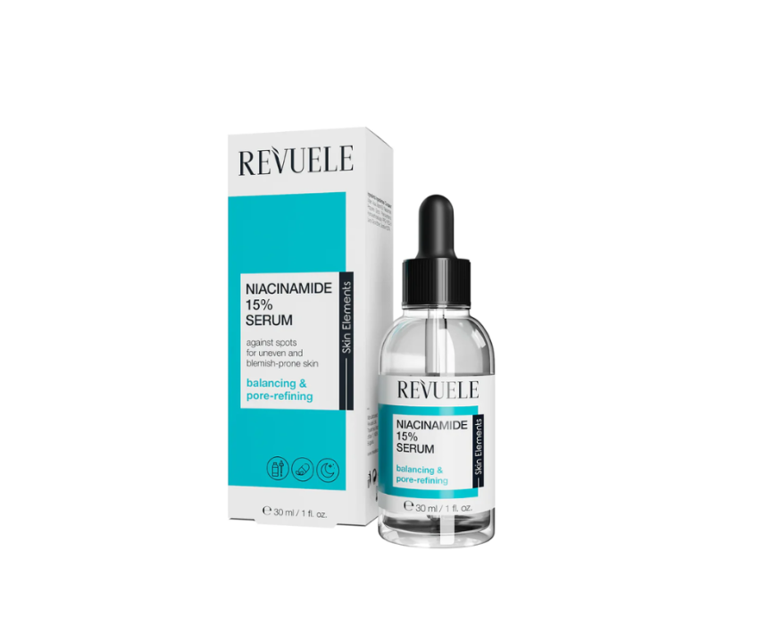 REVUELE NIACINAMIDE 15% SERUM is a high-potency skin-clarifying serum designed to regulate sebum and target imperfections such as blemishes, enlarged pores, uneven texture, and dark spots. Regular use helps smooth, strengthen, and improve the overall appearance of the skin for a healthier, more even complexion.
